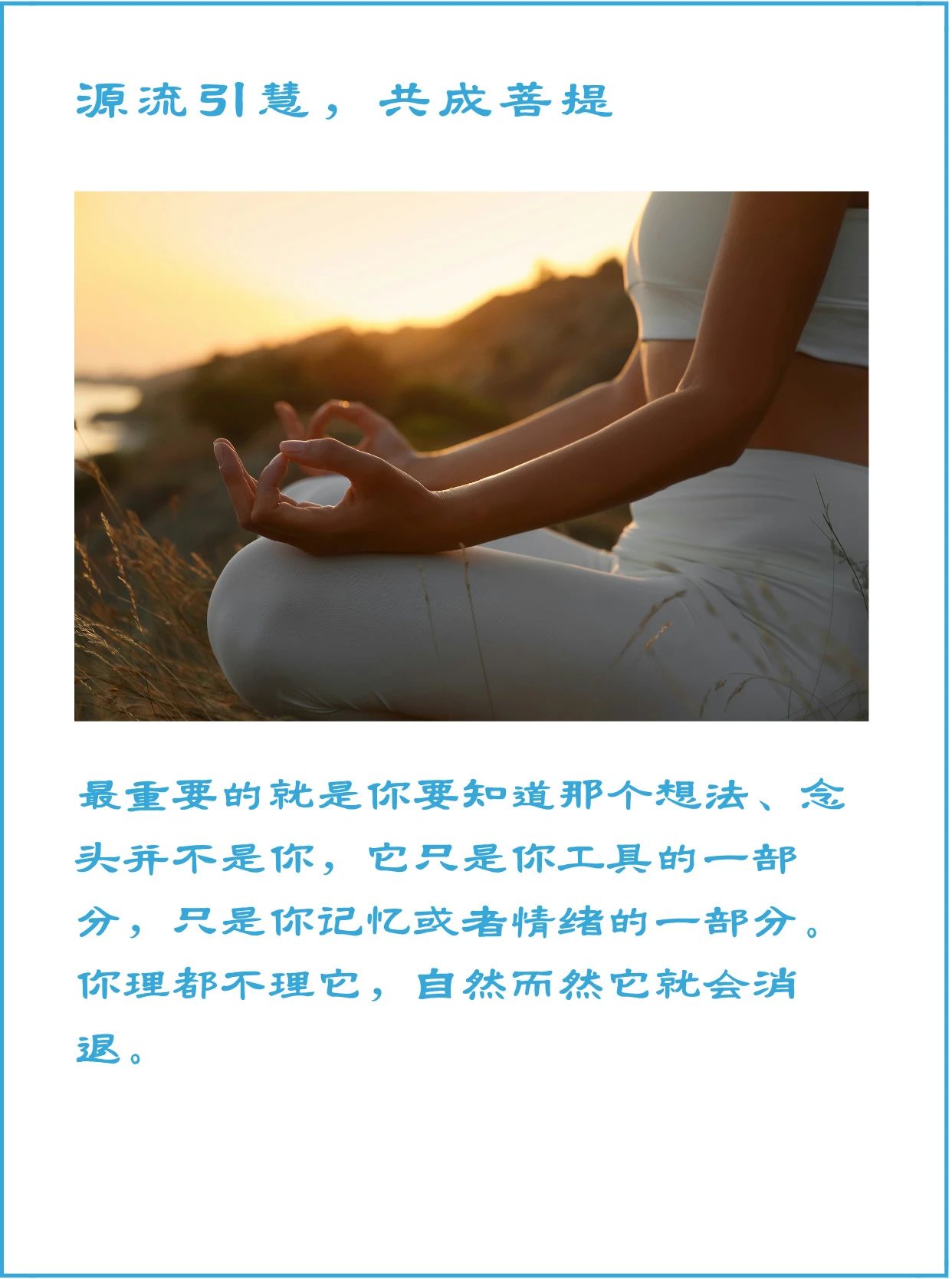 但是最重要的就是你要知道那个想法、念头并不是你,它只是你工具的一部分,只是你记忆或者情绪的一部分。如果你没有任何检查、毫无条件地对它认同的话,这是“我”的想法、“我”的念头,那它一定会带着你走向情绪的深渊。当你对它不认同,不把它当做自己,只是一个想法、念头来了,你就看着这个想法、念头,你理都不理它,自然而然它就会消退。