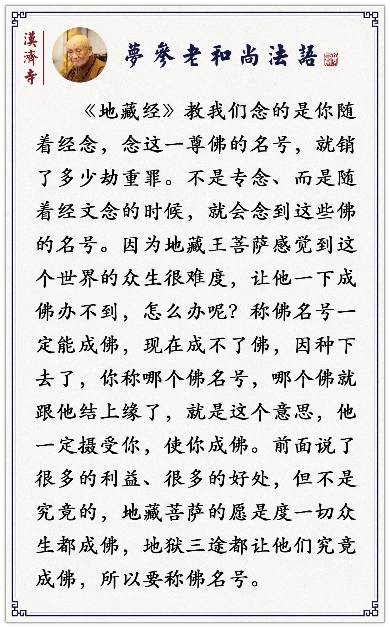 这是《地藏经》的特殊利益,地藏菩萨特别地加持众生,晓得娑婆世界众生无暇修行,在修道时候没有时间,为了求生活,念念这个《称佛名号品》、《地藏经》的一部分,可以把你过去所造的罪、要受报的时候是五无间罪(消了)。
