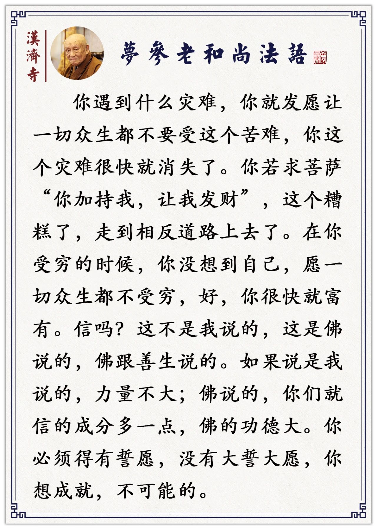 如果你这样想,当你苦难的时候,你不但想,而且这样去做,你跟普贤菩萨、文殊师利菩萨、地藏菩萨、观世音菩萨画等号。虽然你地位没到,但是你这个心达到了,心成一切法成。
