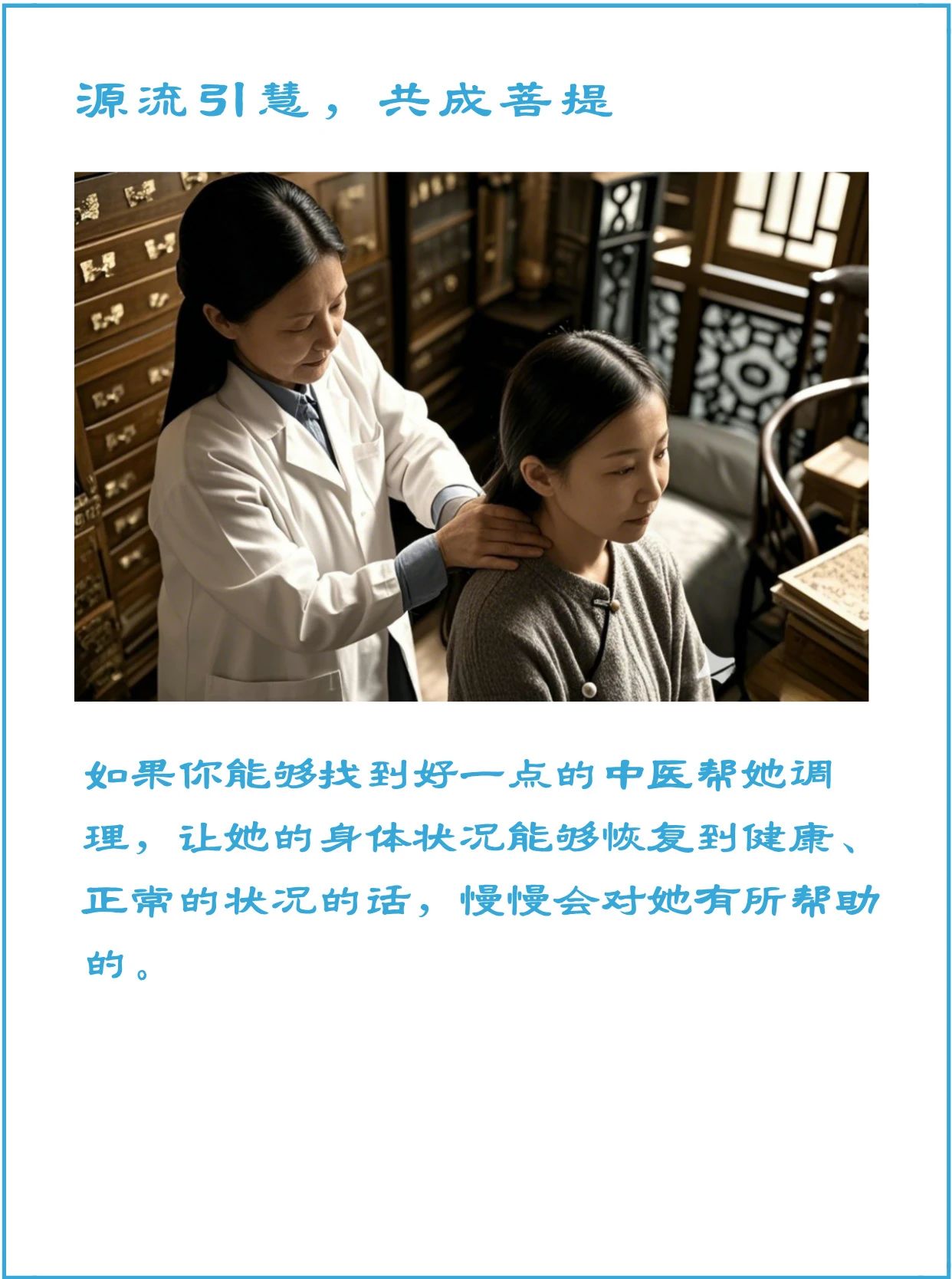 还是要好好地去找医生。因为每个人的情况都不一样,现在西医的方式有好处也有缺陷,所以尽量多找一找中医调理这方面的医生,而不是用西药来给她解决问题。如果你能够找到好一点的中医帮她调理,让她的身体状况能够恢复到健康、正常的状况的话,慢慢会对她有所帮助的。