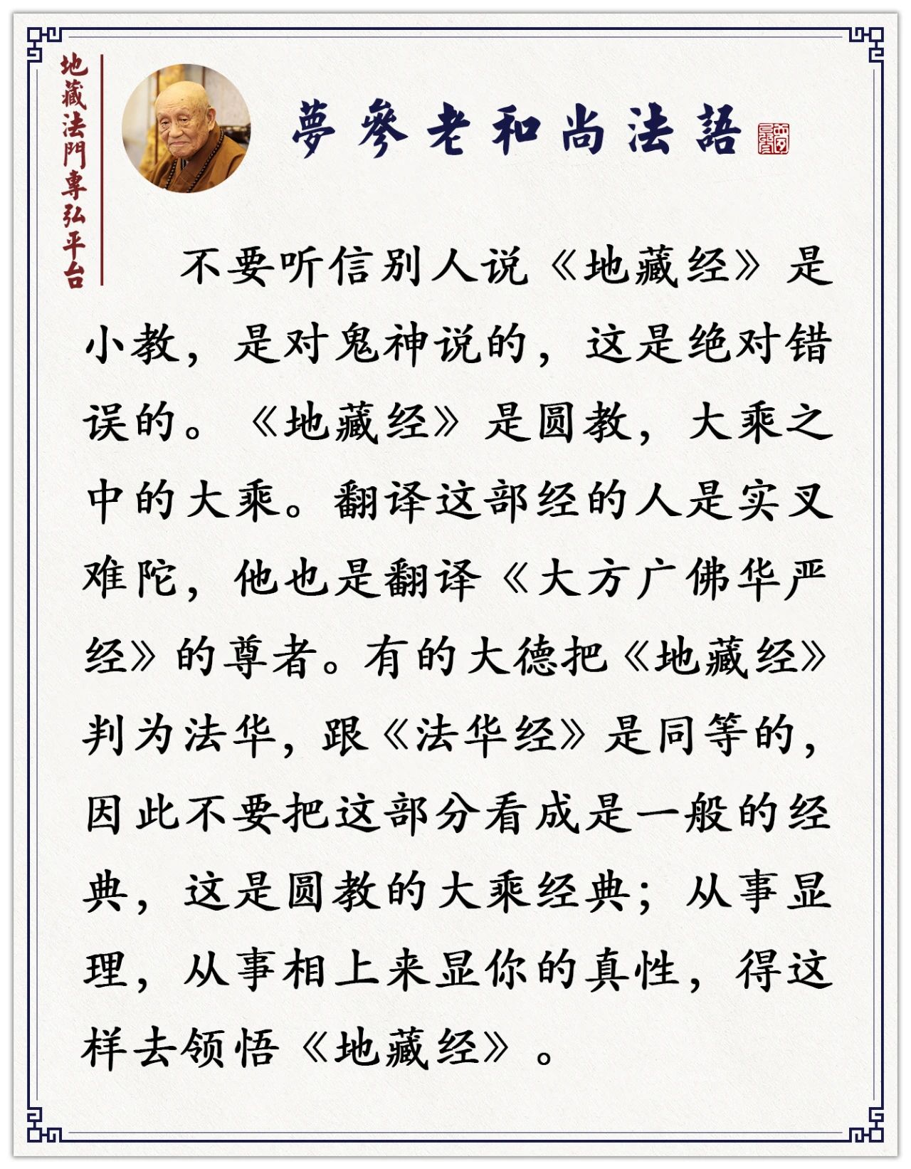 梦参老和尚:我们这边都讲鬼神,地藏菩萨、坚牢地神是专门管鬼神的。同时在这末法时代,我们做任何事情都障碍很多,修道乃至搞贸易、做生意、在家庭的关系上,灾难重重,就念地藏菩萨把这些问题都解决了。