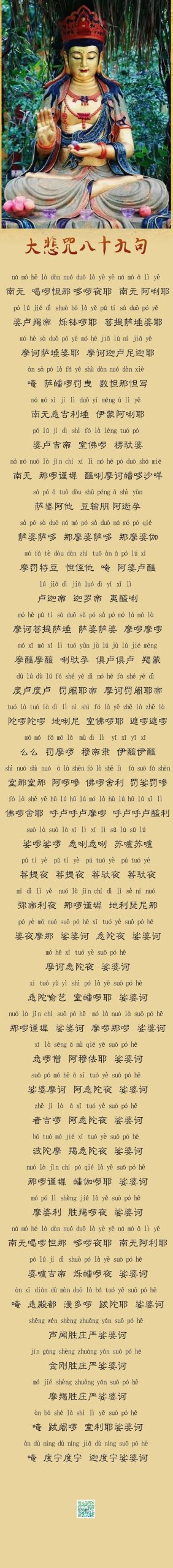 我们念的大悲咒是八十九句的,最后五句是“声闻胜庄严娑婆诃,金刚胜庄严娑婆诃,摩羯胜庄严娑婆诃,唵 跋阇啰室哩曳娑婆诃,唵 度宁度宁迦度宁娑婆诃”。