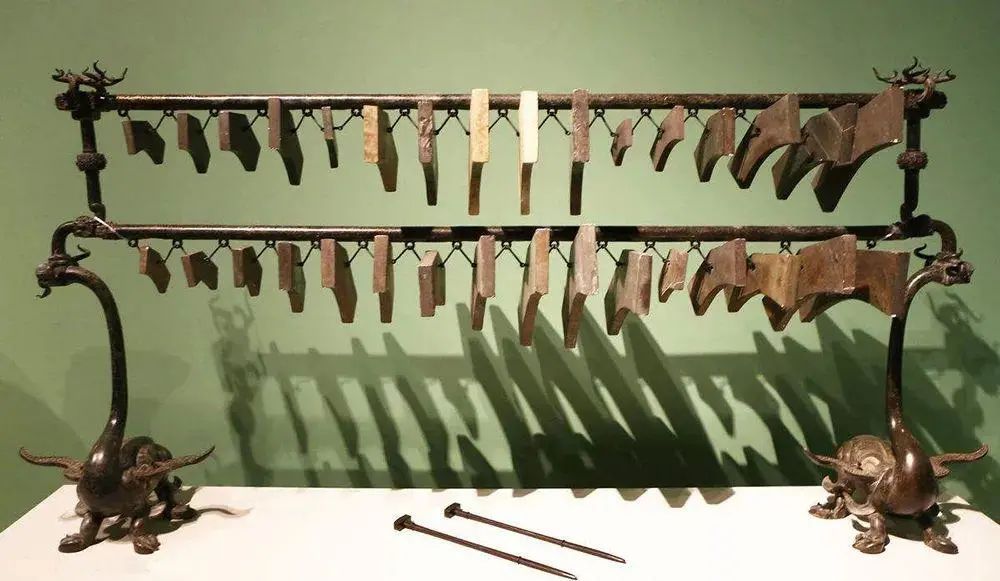初期使用玉料和石料所造的“磬”,是把石块磨成石片,形状如“矩”,中间折曲,两端低垂。有如日本字母的“︿”字,也很像我国“注音符号”的“ㄟ”字一般。造“磬”的方法,在考工记(考工记:书名,一卷;言百工之事。即周礼之第六篇,亦名冬官考工记)一书中曾有叙述。