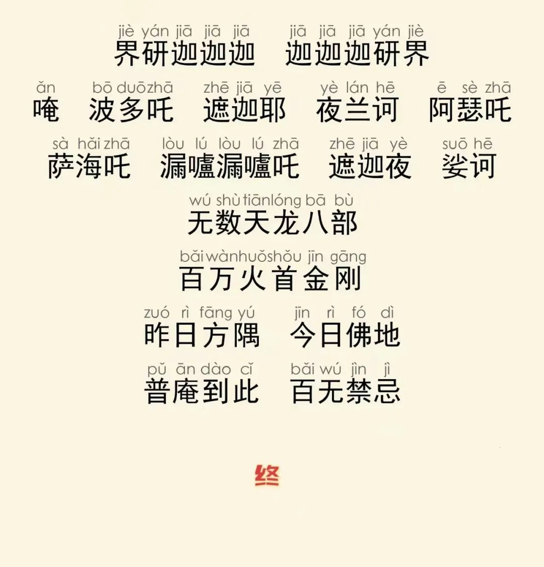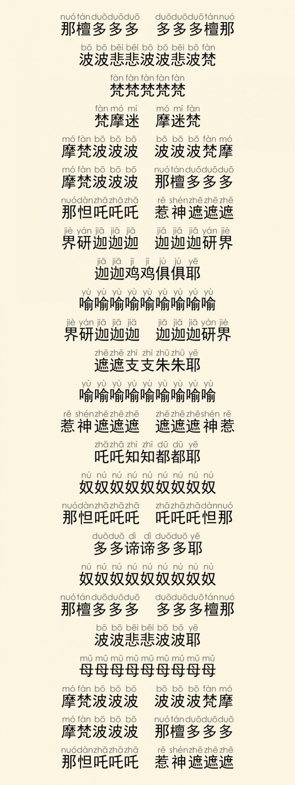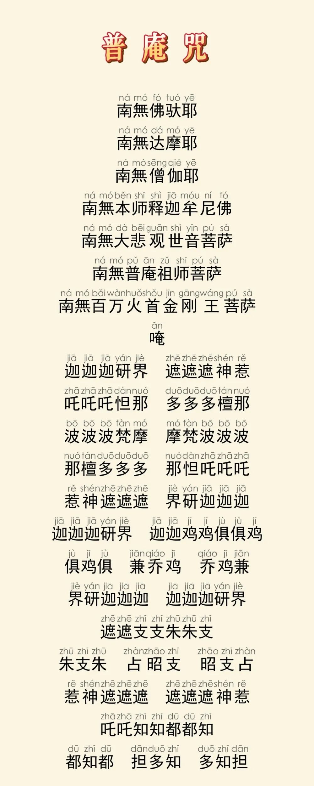 普庵咒的威神之力可不得了,你一诵,在天地之间的万物全都听从你的指挥,百无禁忌。如果一个人出去行脚参学,必须诵普庵咒。