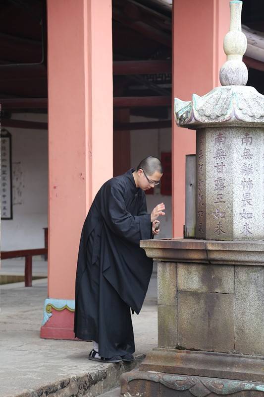 大众回向毕,排班回大殿“拜愿”,高唱“南无本师释迦牟尼佛……”,东西单此起彼伏,这是大雄宝殿最庄严的时刻。