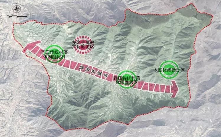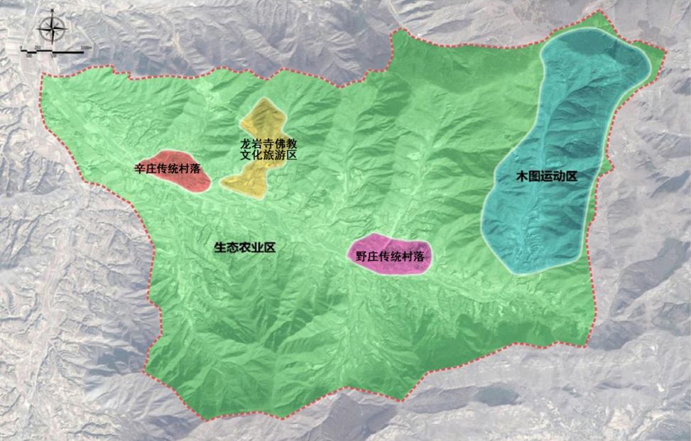 三区:辛庄传统村落休闲度假区、 野庄传统村落休闲度假区、木图休闲运动区。