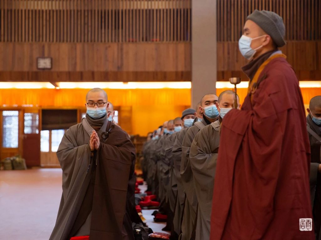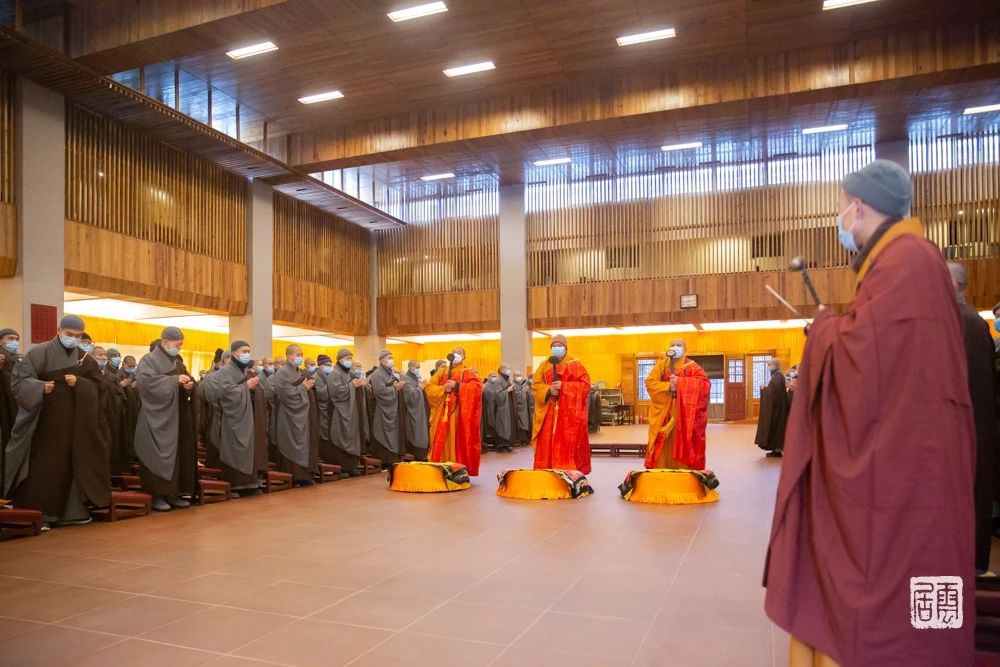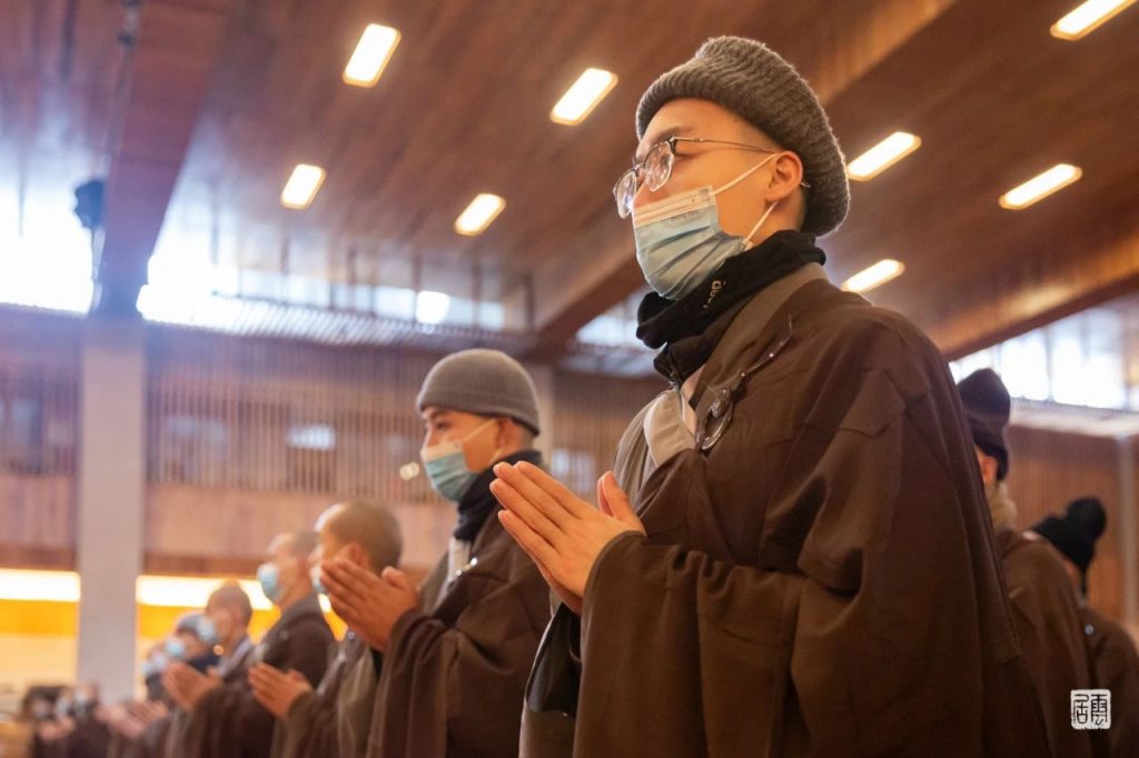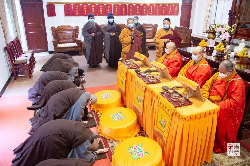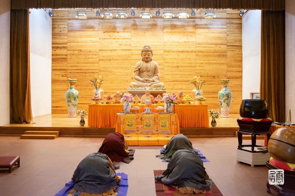12月1日,上午八时,引礼师带领新戒于正觉苑整齐排班,恭请三师至正觉苑。新戒至诚顶礼,长跪合掌,请求开导。