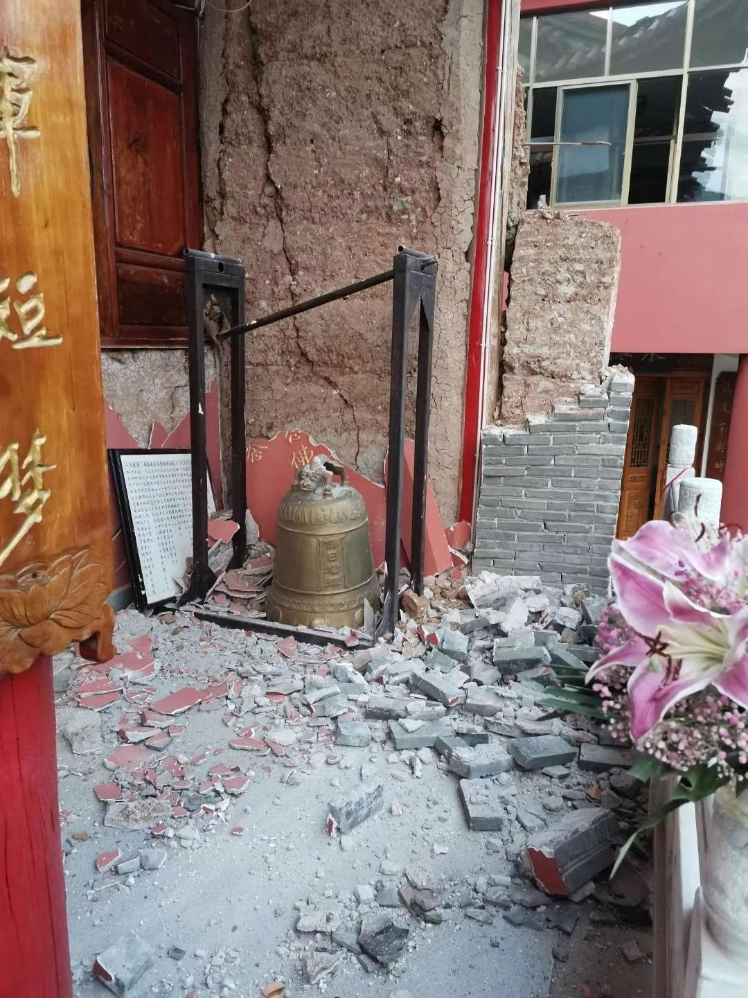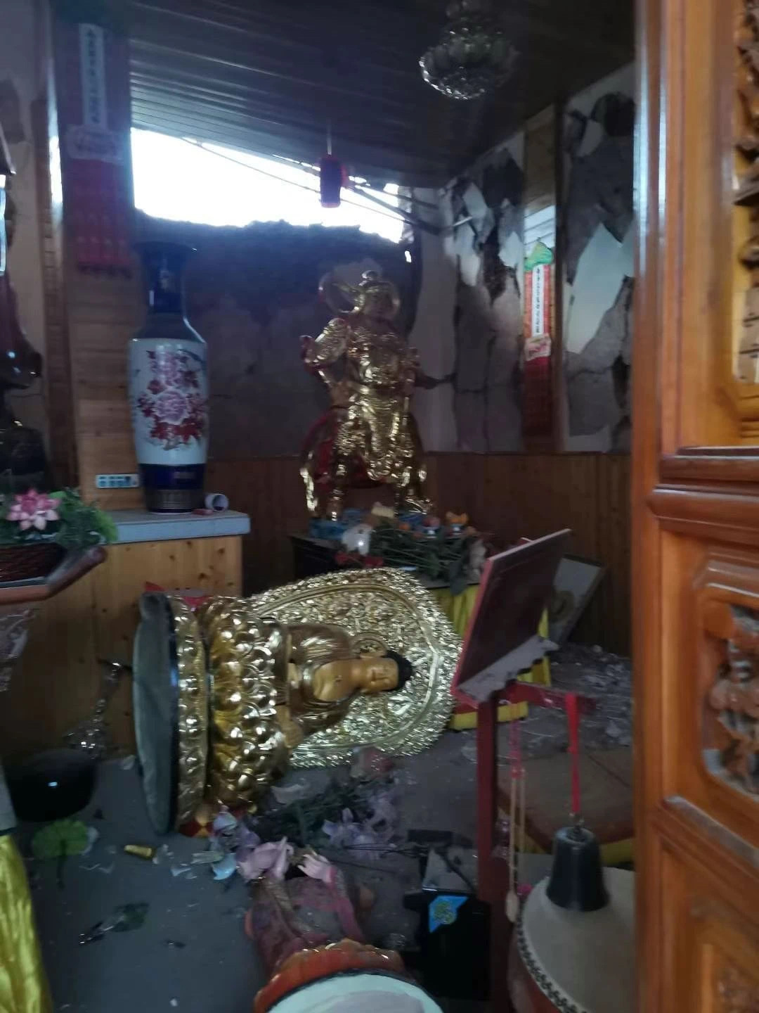 坍塌的大雄宝殿,歪斜在地的诸佛像,震裂的墙壁......着实令人揪心!
