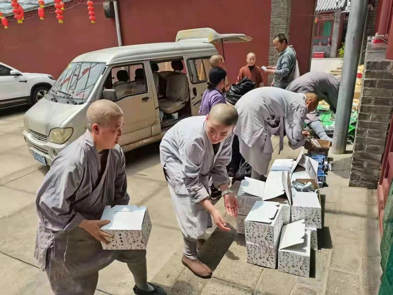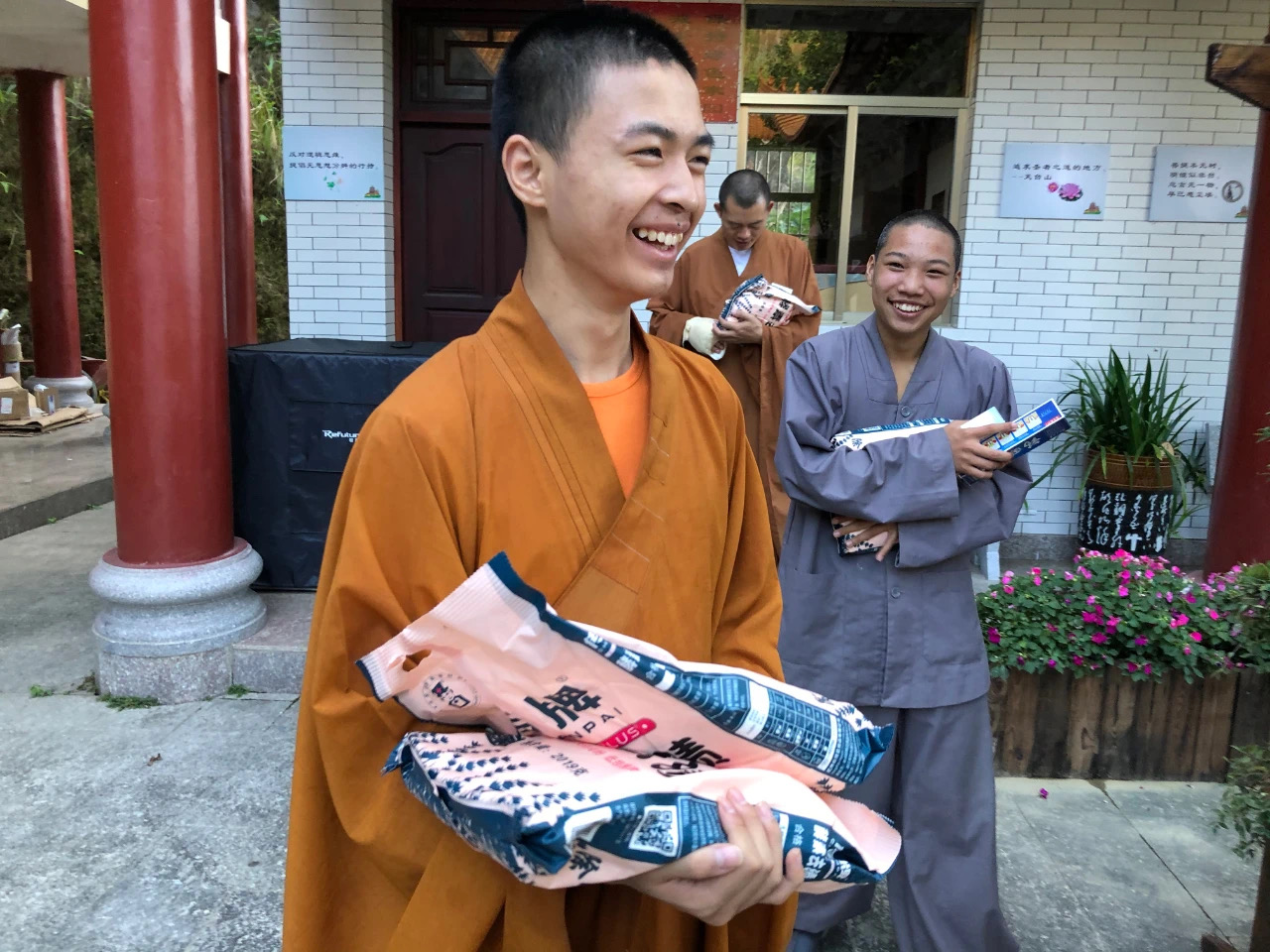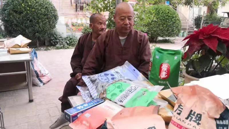 物资包含着端午素粽、各类蔬菜、枸杞和牙膏牙刷洗衣粉等齐全的物品,井然有序地被送入一座座道场。师父们将收到的物资仔细摆放,小心翼翼地分类好这笔善款所筹的每个物品。优先拿给最需要的僧人,带着万分珍重的一颗心。看到师父们手捧物资,面容恬静又欢喜,于我们而言,已然足够。