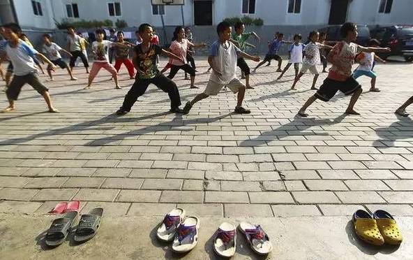 学习少林功夫是孩子们最高兴的事,天气炎热,男孩子们索性光脚练功。