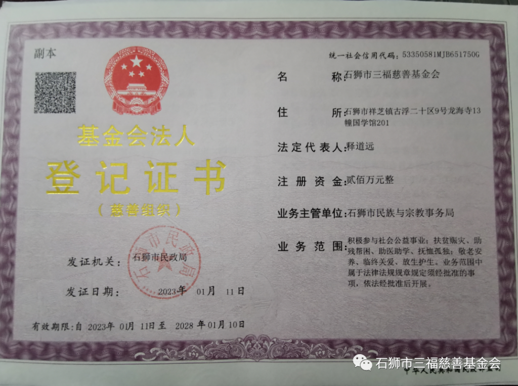 石狮龙海寺自2014年开展慈善工作以来,一直秉承着“佛教慈悲济世精神,发展社会公益慈善事业”的宗旨,接受和管理慈善资金,积极开展大病救助、扶贫济困、捐资助学、敬老安养等活动,截止2022年底累计社会捐赠670余万元,为社会公益慈善事业发挥了积极作用。石狮市三福慈善基金会将成为广大热心公益慈善人士投身公益慈善事业的好平台。